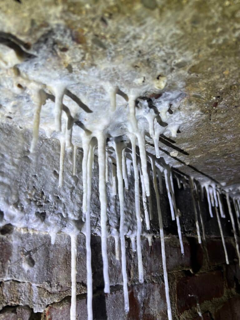 Du plafond pendent des formations blanches, comme des stalactites dignes de Lascaux. Évidemment, pas de fresques rupestres ici, mais des dépôts de sels minéraux façonnés par l’eau. Visuellement impressionnant, surtout quand on n’en a jamais observé d’aussi développées.
